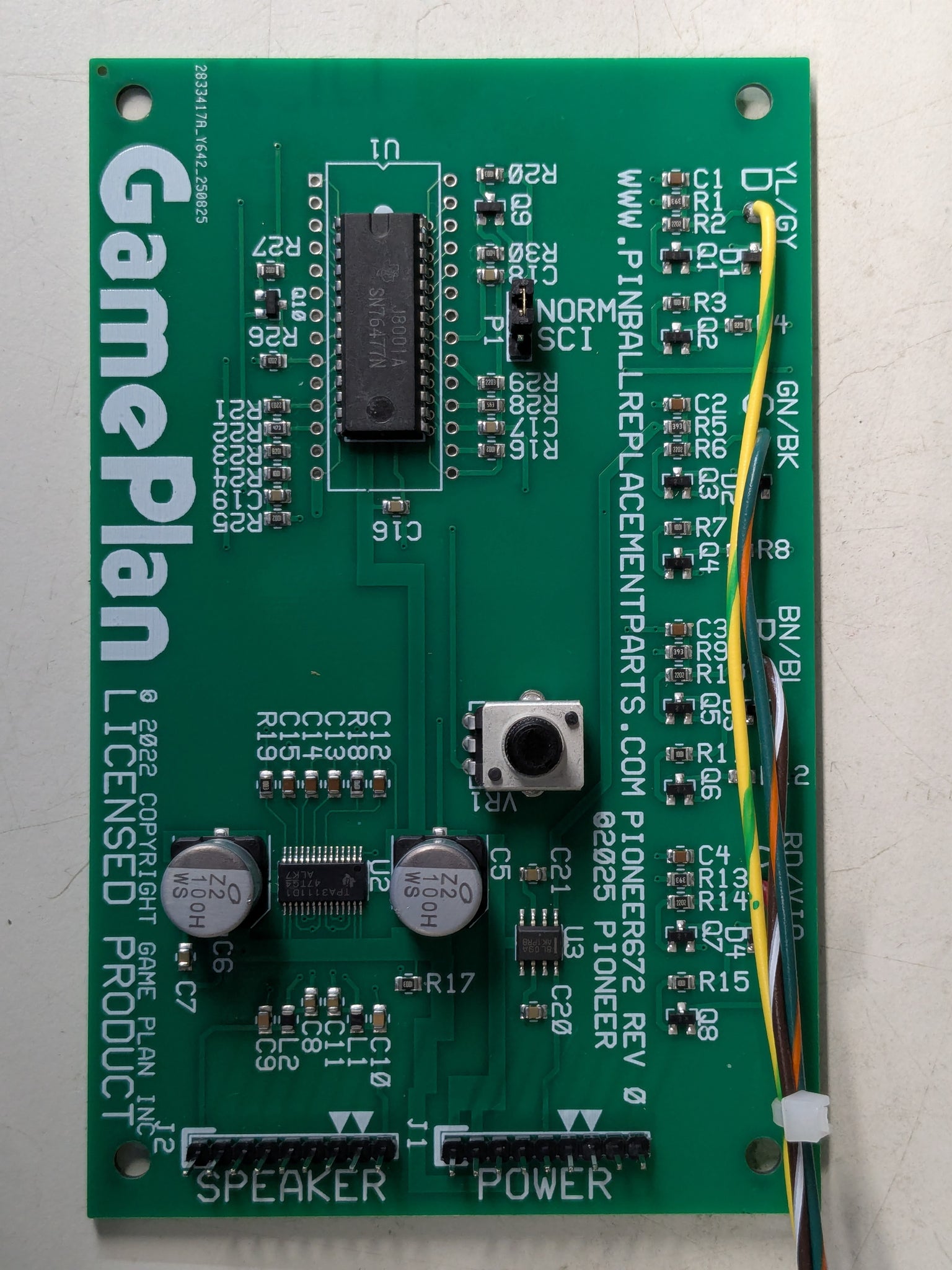 This board was used on many of the early Game Plan cocktails, and replaced the 4 chime unit. It is based on the same circuit, but has a modern audio amplifier on it.